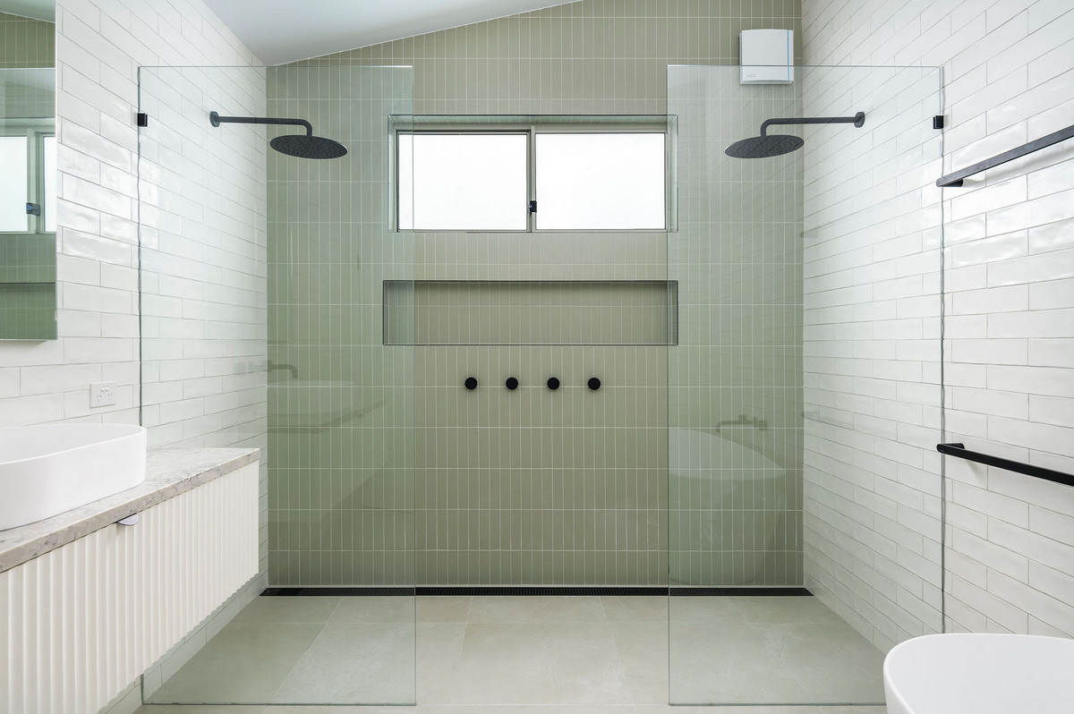 – Luxurious bathroom with bathtub, double shower and floor-to-ceiling tiles
