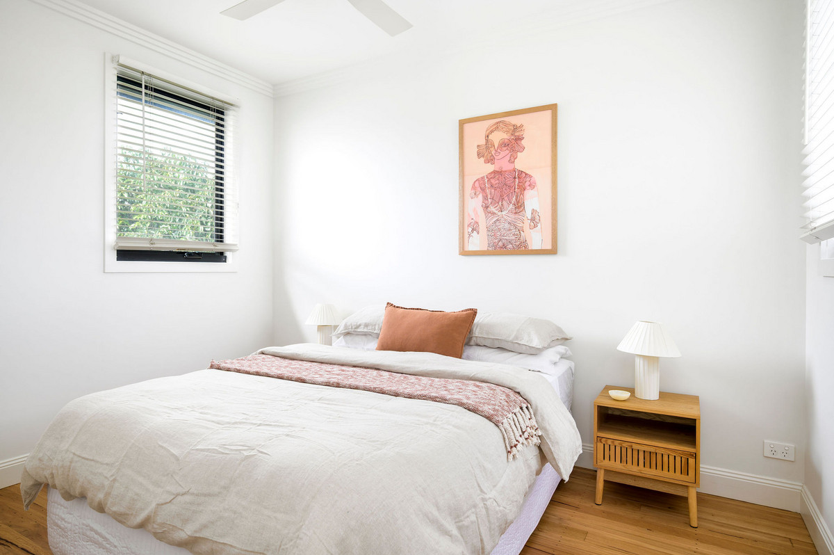 Upstairs, beautiful Australian species timber floorboards lead you to two generous bedrooms, one of which spills onto a balcony overlooking the leafy street. The bathroom is stylish with luxe floor-to-ceiling tiles, and downstairs the laundry is tucked away—complete with a handy second toilet.