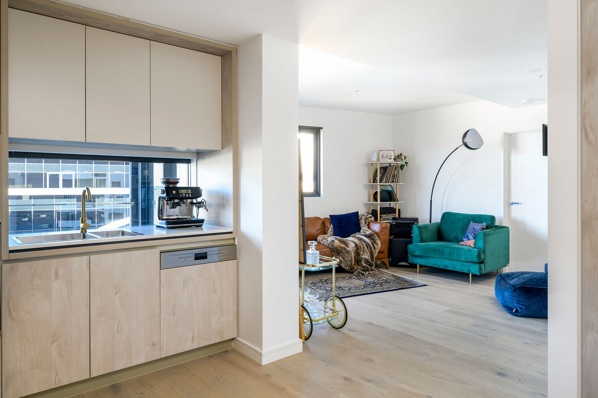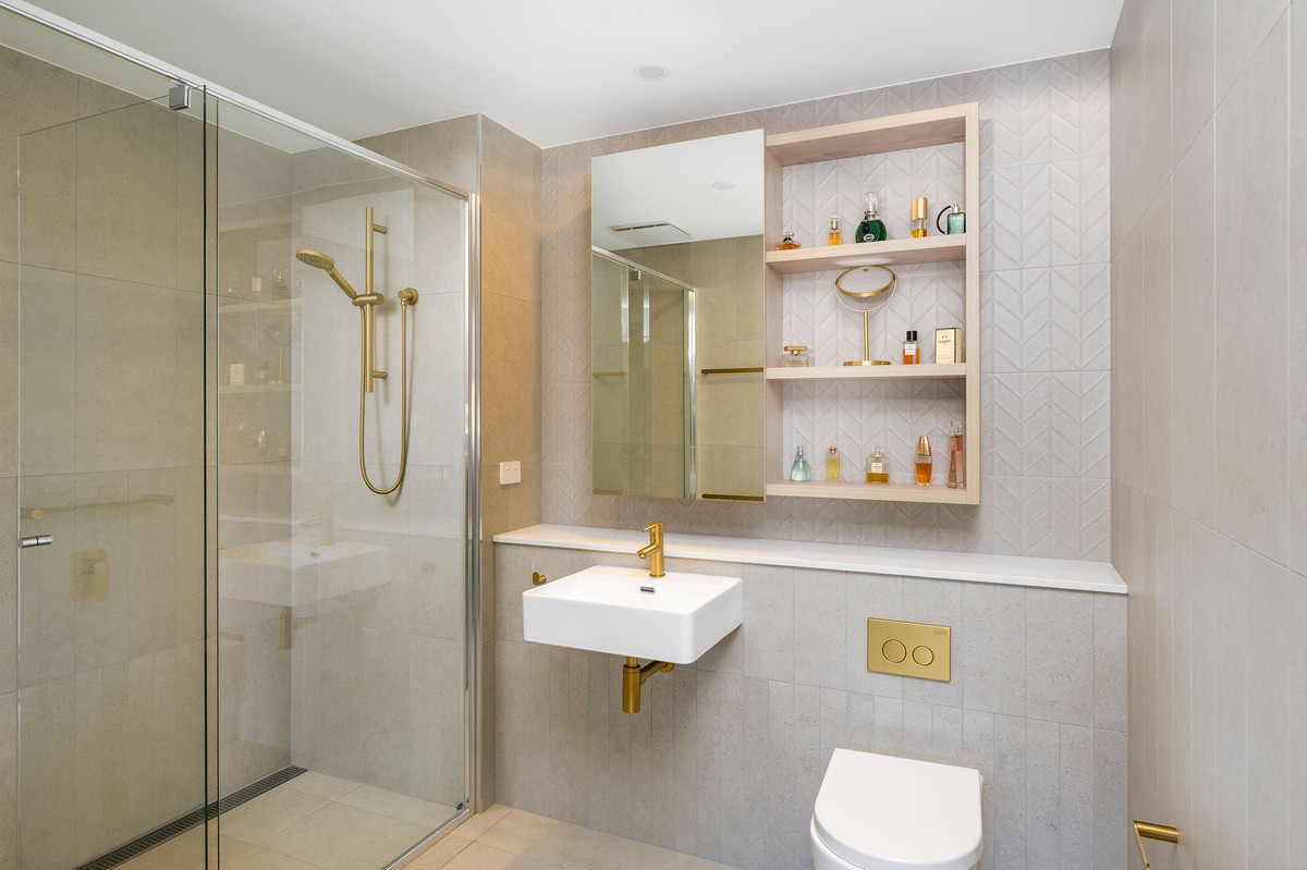 The kitchen and living area are clean and contemporary, but it’s the bathrooms that make a real statement—complete with gold tapware for a luxe, boutique-hotel feel.