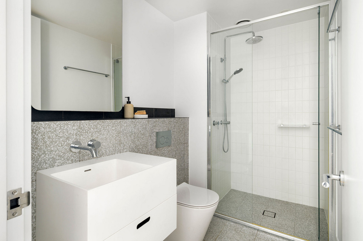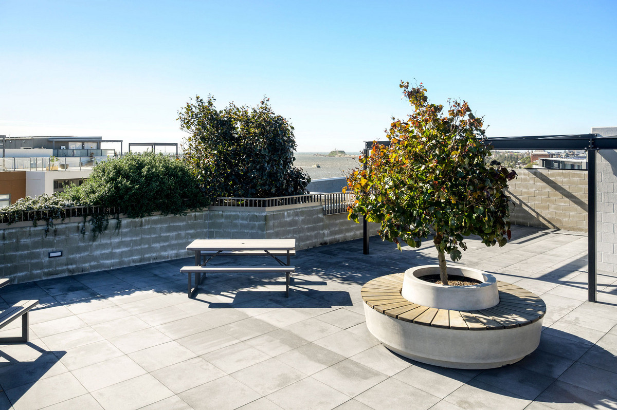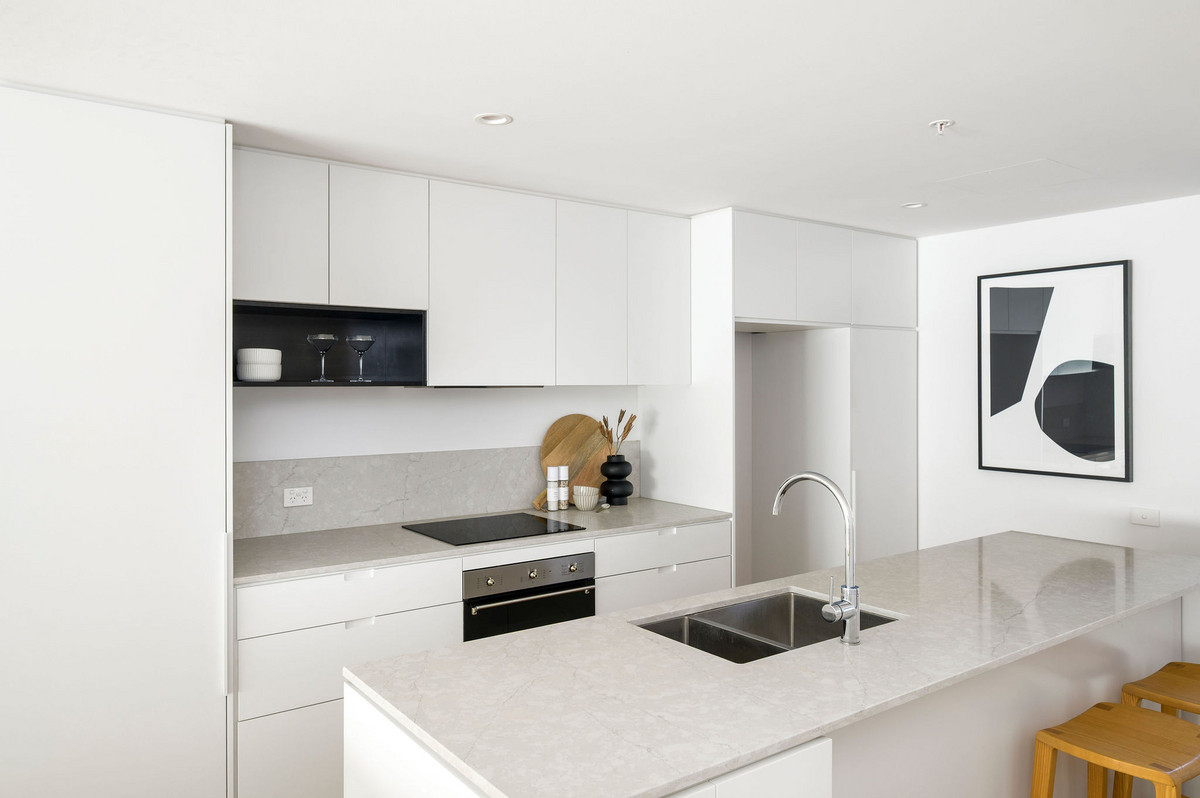 Inside, it’s all clean lines, floating floorboards, and luxe finishes. Think stone benchtops, induction cooking, ducted air, and a designer kitchen that’s as sharp as the skyline view from your balcony. The open-plan living zone flows effortlessly to outdoor entertaining, while both bedrooms offer generous proportions—plus the master comes with its own ensuite.